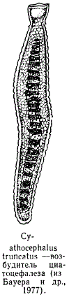 Эпизоотология. Циатоцефалюсы обитают в кишечнике, преимущественно в пилорических придатках лососевых, изредка осетровых и некоторых других пресноводных рыб в северных и восточных районах страны. В Сибири заболевание зарегистрировано у окуня и щуки. В Рыбинском водохранилище заболевание отмечено у 40—45% судаков, щук и налимов при интенсивности инвазии до 62 паразитов на рыбу. Наиболее подвержены циатоцефалезу лососевые и сиговые, зараженность которых у 80—90% стада достигает 80 паразитов на рыбу. Зараженность увеличивается с ростом рыбы. В прудовых хозяйствах гельминты встречаются у форели после перехода на питание бокоплавами. У взрослой форели наблюдалось от 80 до 400 гельминтов. Заражение рыбы происходит осенью и зимой, т. е. в период поедания зараженных рачков с процеркоидами.
