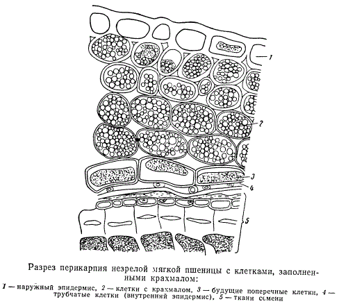 На рисунке изображен поперечный разрез периферического участка зерновки пшеницы. Снаружи расположен ряд слоев, принадлежащих стенке плода (перикарпий). Наружные три слоя перикарпия построены более или менее одинаково из клеток, слегка вытянутых по длине зерна. За этими слоями идет слой поперечных клеток, названных так вследствие того, что их продольные оси идут поперек длинной оси зерна. На поперечном разрезе это наиболее длинные клетки. К поперечным клеткам обычно примыкает слой трубчатых клеток (на рисунке не виден), которые лежат почти совершенно отдельно друг от друга, в большинстве случаев касаясь соседних клеток той же ткани лишь частью своего тела. Поэтому среди трубчатых клеток образуются большие межклетные пространства. Трубчатые клетки — это клетки внутреннего эпидермиса плодовой оболочки перикарпия. Ими ограничивается стенка плода и глубже начинается уже кожура семени, сильно облитерированная. К кожуре семени примыкает алейроновый слой эндосперма.